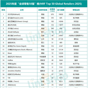 4月17日,美国零售联合会(NRF)公布2025年全球前50名零售商名单,该榜单源于Kantar Retail数据,根据2024年零售商的国内和国际零售收入计算分数进行排名,上榜的公司要在至少三个国家和地区进行直接投资。