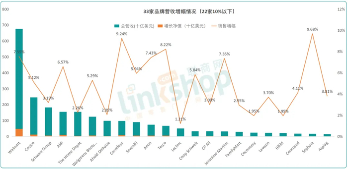(4)紧随其后的是ALDI奥乐齐、Costco开市客、Ahold Delhaize(阿霍德·德尔海兹)、家乐福、Seven&i、宜家(IKEA)和家得宝(The Home Depot)。