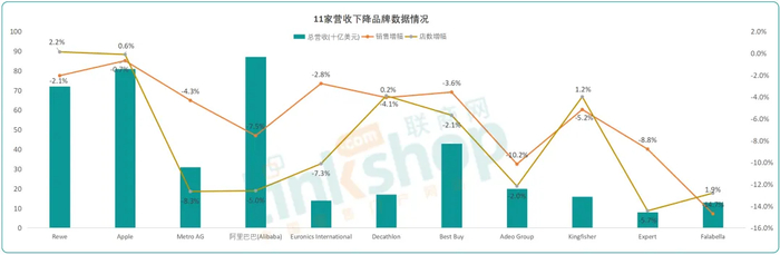 (3)44家企业中,有11个营收下降,占比25%。其中Falabella营收下降14.7%,安达屋集团(Adeo Group)营收下降10.2%,Expert营收下降8.8%,跌幅略大。