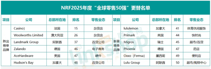 NRF研究执行董事马克·马修斯表示,“今年的全球前50零售商名单涵盖了众多与全球消费者产生共鸣的企业。尽管全年市场充满不确定性,但消费者支出依然保持高位,零售业在2024年继续增长”。