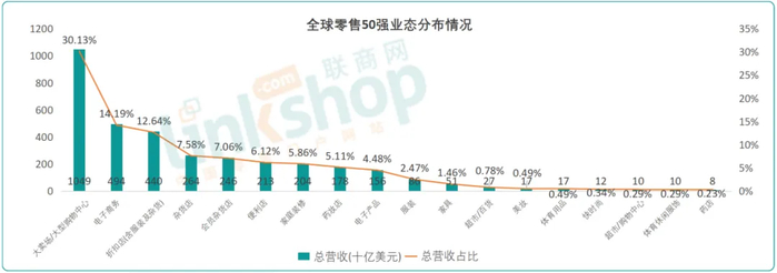 从业态上看,全球TOP50中,大卖场/大型购物中心业态总营收占比30.1%,相对2024年榜单数据提升0.9个百分点;折扣店占比12.64%,相对2024年榜单数据提升0.34个百分点,会员店7.06%,各业态具体如下: