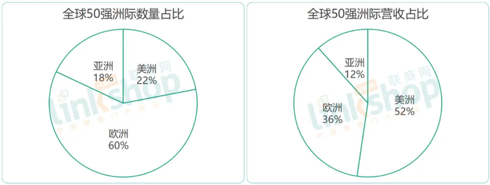50强榜单中,欧洲企业分布数最多,有30家;但从总营收看,美洲最高,主要是美国9家企业比较强大,营收在总榜单中占比近51%;亚洲日本有5大企业入围,4家排位都有所上升,迅销集团(Fast Retailing)更是上升了7位,也在一定程度上体现了日本零售业的全球实力。