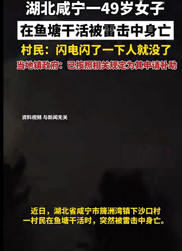 4月22日消息,据媒体报道,一位网友称,自己的妻子下雨天在鱼塘边做事,被雷击中不幸去世。