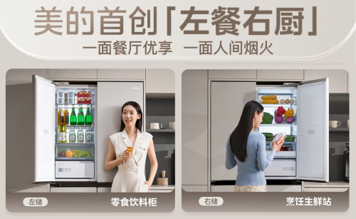 美的餐边柜冰箱更是全球首台实现“左餐右厨”分储功能的冰箱,彻底告别了传统冰箱厨房烹饪食材与餐厅休闲即食混放的局面。冰箱分为左右两部分,左边为餐厅区域,右边为厨房区域,16个分区科学布局,每个区域都有精细的指引,收纳简单,拿取从容,满足不同场景下的多样化需求。