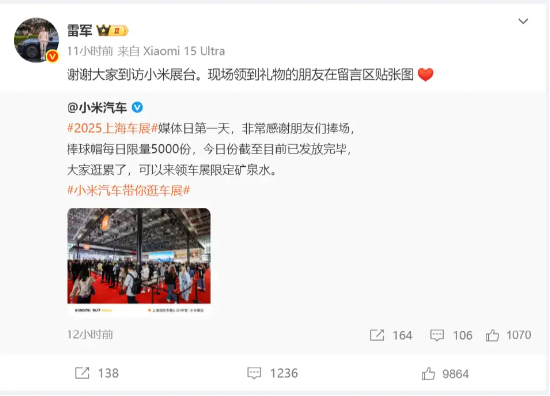 但小米的雷氏营销风格依旧,展台虽然没有发布会,也没有新车小米YU7,但通过在展台现场发放限定矿泉水和限量棒球帽,也是赚足了人气。雷军还专门在微博写道:“谢谢大家到访小米展台,现场领到礼物的朋友在留言区贴张图。”