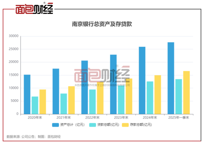 截至2025年一季末,南京银行的总资产突破2.7万亿,存贷款均保持增长。其中,存款总额较年初增加超1610亿元,新增存款已超过2024年全年水平。