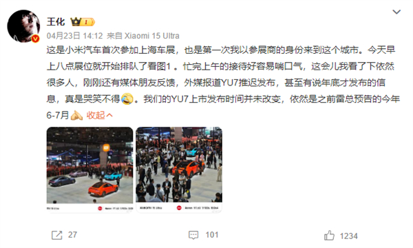 值得一提的是,王化昨日也回应了小米YU7上市发布时间,“依然是雷总预告的今年6-7月”。