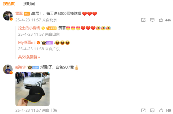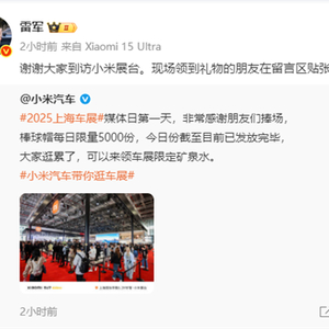 雷军在微博发文并留言称:“谢谢大家到访小米展台,现场领到礼物的朋友在留言区贴张图。车展上,每天送5000顶棒球帽。”
