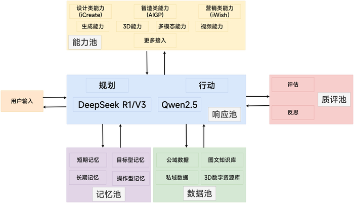这背后需要能力池、数据池、记忆池、响应池、质评池五大核心组件,囊括海量行业知识,可以调动各环节数字化工具,具备客户使用的短期记忆和长期记忆,能够对客户需求进行智能化分析和任务分解,还能够主动学习自我进化。