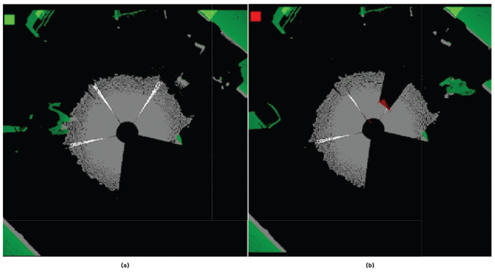 系统采用安全气泡探测算法来探测安全气泡半径内的物体。探测标志以ROS 话题(Topic)的形式传输,主机可以订阅所有模块的话题,并合并各个探测结果。此外,这些模块还可发布深度图像、红外图像和输出图像以供进一步分析。ROS提供了有效的可视化工具,例如rviz,它可以将发布的话题可视化。该应用设计为高度可配置的,将参数传递给ROS节点即可调整摄像头位置、旋转角度和其他配置值。
