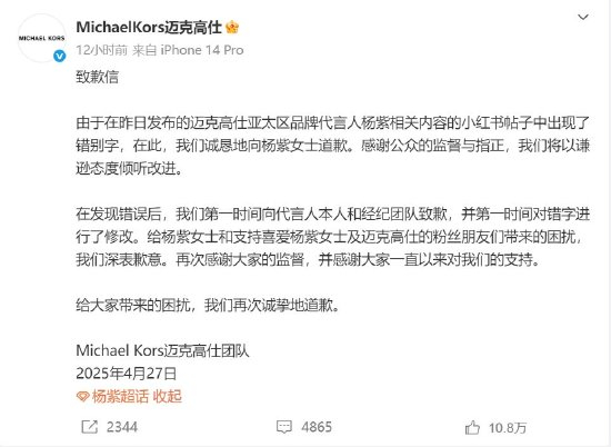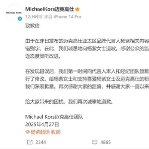 Michael Kors迈克高仕今日在官微发布致歉信:“由于在昨日发布的迈克高仕亚太区品牌代言人杨紫相关内容的小红书帖子中出现了错别字,在此,我们诚恳地向杨紫女士道歉。在发现错误后,我们第一时间向代言人本人和经纪团队致歉,并第一时间对错字进行了修改。给杨紫女士和支持喜爱杨紫女士及迈克高仕的粉丝朋友们带来的困扰,我们深表歉意。再次感谢大家的监督,并感谢大家一直以来对我们的支持。”