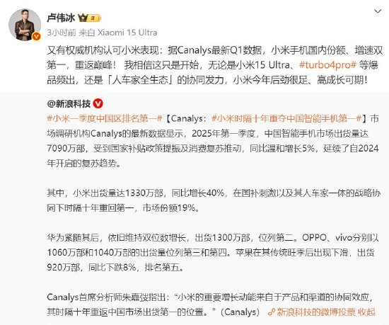 小米集团公关部总经理王化也发文称:“汇报一个好消息,Canalys最新数据显示,2025年第一季度,小米出货量达1330万部,同比增长40%,在国补刺激以及其人车家一体的战略协同下时隔十年重回第一,市场份额19%。”