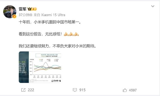 小米集团CEO雷军在微博上发文表示:“十年后,小米手机重回中国市场第一。看到这份报告,无比感慨!我们还要继续努力,不辜负大家对小米的期待。”