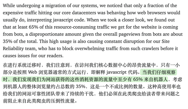 前段时间维基媒体就发现,那些走美国数据中心的高成本流量,居然有 65% 都是 AI 爬虫糟蹋的。
