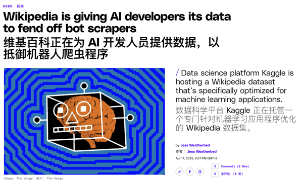 前段时间,维基媒体把英语、法语的维基百科内容托管在社区平台 Kaggle,告诉那些 AI 公司,要资源自取。