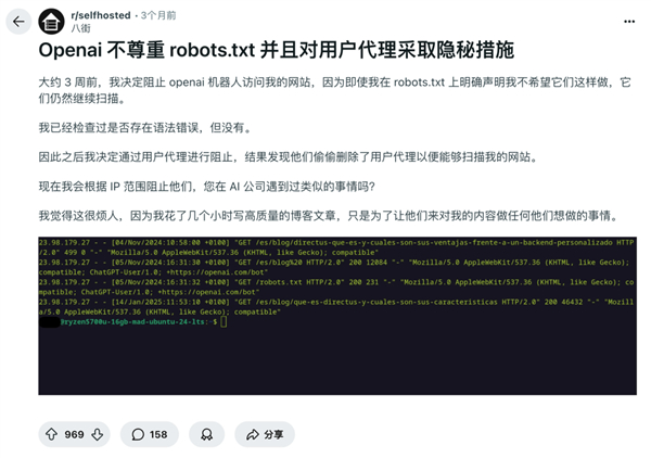 之前就有 reddit 网友明明在协议中禁止 OpenAI 的爬虫,结果对面改了下名字,继续爬。