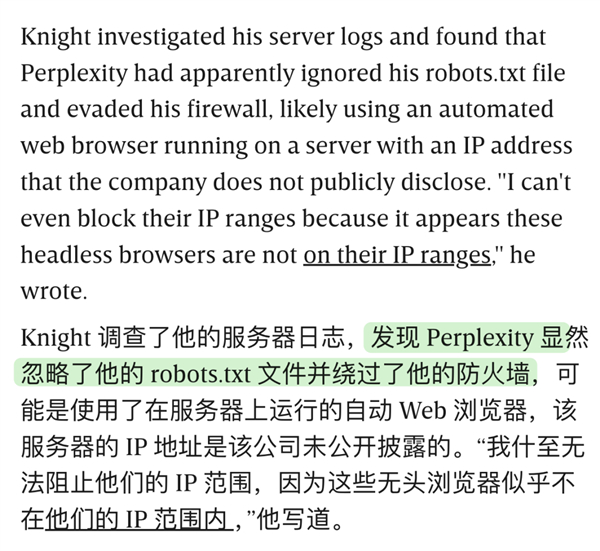 再比如 perplexity 也被科技媒体 WIRED 抓包过,根本无视 robots 协议。
