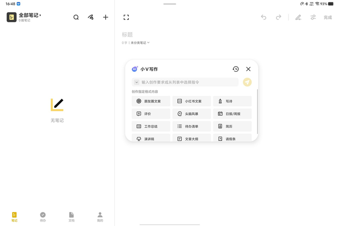 AI技术的深度融入,是vivo Pad5 Pro办公生产力的核心亮点。基于系统级蓝心大模型,平板内置的“小V写作”可提供智能排版、逻辑优化建议;“小V帮记”则能实时转录会议语音并生成结构化笔记,甚至支持关键信息的智能提取与分类。