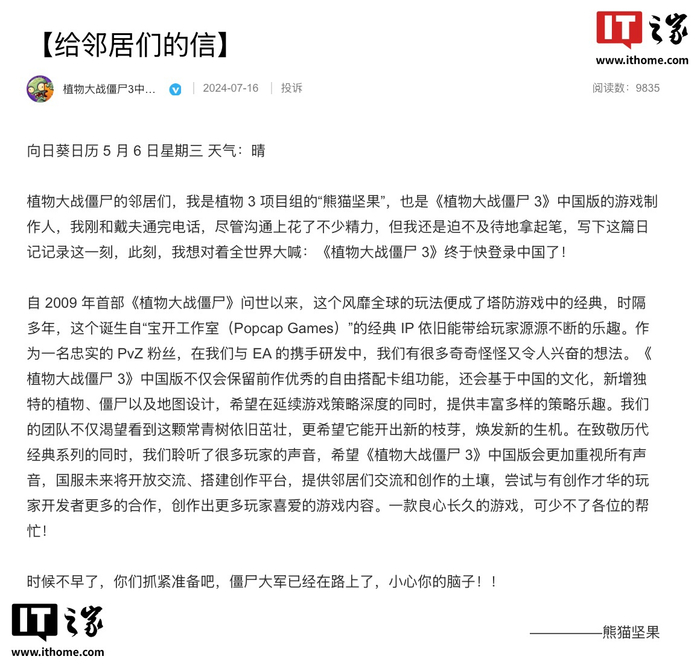 去年 7 月,《植物大战僵尸 3》官博发布了“给邻居们的信”,信中《植物大战僵尸 3》中国版的游戏制作人熊猫坚果透露,《植物大战僵尸 3》中国版不仅会保留前作自由搭配卡组功能,还会基于中国文化新增独特的植物、僵尸以及地图设计。