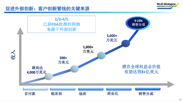 其他CXO能做到这样且能拿这么多的目前有且仅有药明,有1就有2,不出意外的话,未来蓬勃生物类似这样的收入会越来越多。在药明生物的规划中,未来最大的收入来源会变成药品的销售分成,药明如此,目前看来金斯瑞也有这个潜力。