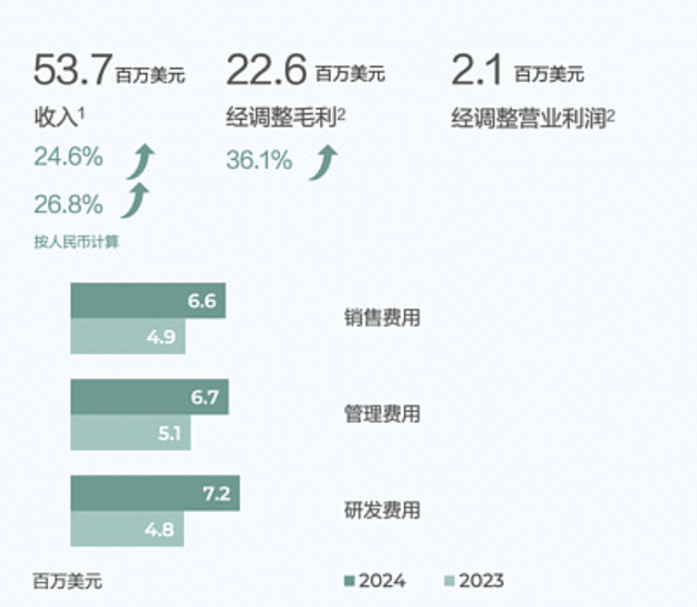 百斯杰的毛利是在提升的。经调整毛利约为2260万美元,同比增长36.1%,经调整毛利率由上期的38.5%增长至42.1%,经营利润没增长主要和研发投入过大以及渠道扩张导致营销费用增加较多有关。2024年百斯杰海外客户的营收占比已提升到19%,同比增长4个百分点,主要客户收入更是同比增长40%,公司表示海外客户关系已取得重大突破。