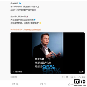 IT之家 5 月 6 日消息,今天早些时候特斯拉官微发布视频称,特斯拉上海超级工厂生产的 Model 3 和焕新 Model Y 的国产化率已经超过 95%,相当于消费者买到的每一辆 Model 3 和焕新 Model Y 上超过 95% 的零件都产自中国。