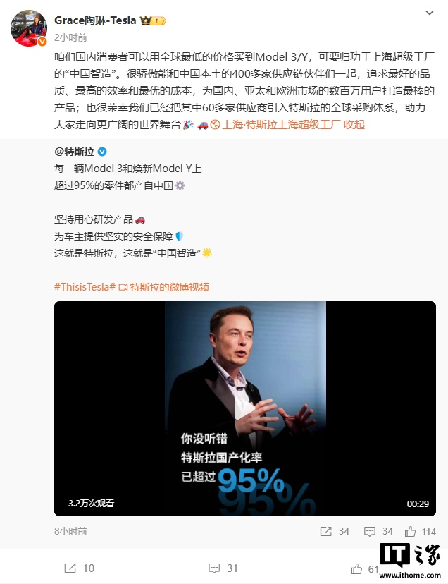 IT之家注意到,随后特斯拉公司副总裁陶琳转发该视频,并发文表示,国内消费者可以用全球最低的价格买到 Model 3 / Y,可要归功于上海超级工厂的“中国智造”。