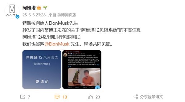 博主实测风阻系数视频被马斯克转发!阿维塔邀请马斯现场见证测试