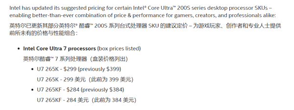 Intel官宣酷睿Ultra 200S降价!Ultra 7 265K/KF比Ultra 5 245K/KF还低