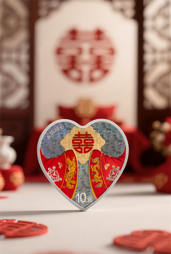 30克心形银质纪念币背面图案为袍袖、“囍”字、吉祥纹样等装饰组合设计,并刊“永结同心”字样及面额。