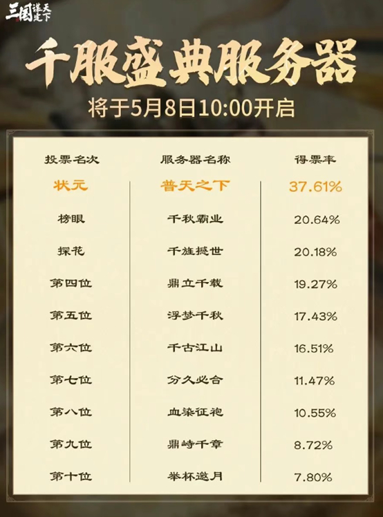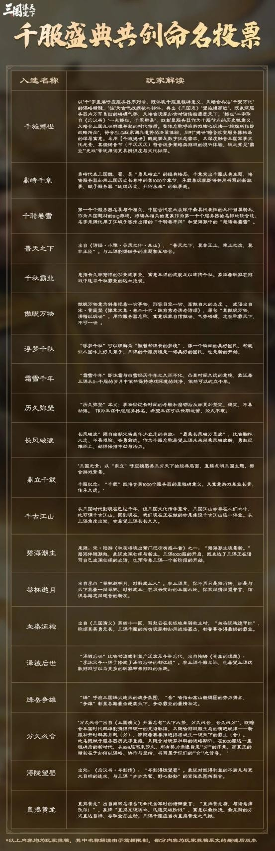 经由游戏综合考量创意深度、文化内涵等多维度标准,最终20个独具特色的服务器名称脱颖而出,成功晋级投票阶段。同时,通过数千名主公的踊跃投票,「千服盛典」的服务器命名共创结果已经诞生,其中“普天之下”得票率最高。