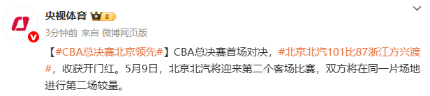 据@央视体育 消息,CBA总决赛首场对决,北京北汽101比87浙江方兴渡,收获开门红。5月9日,北京北汽将迎来第二个客场比赛,双方将在同一片场地进行第二场较量。