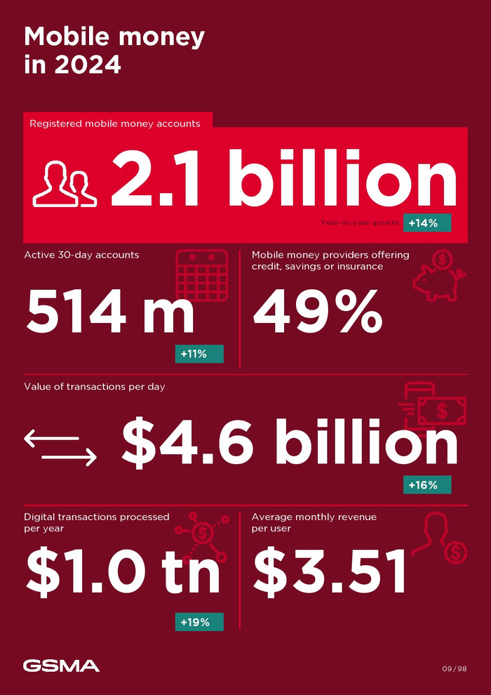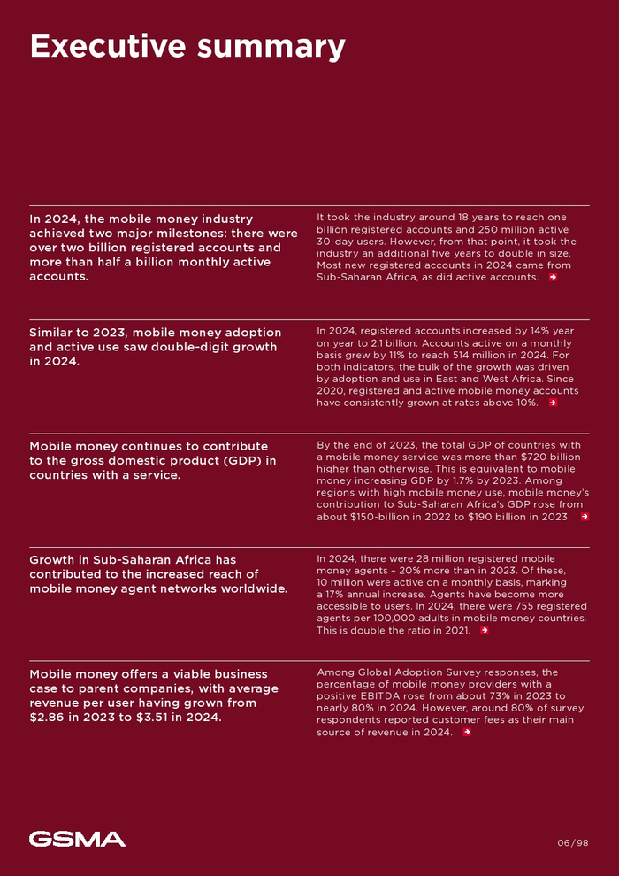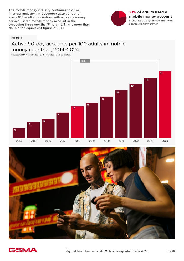 GSMA发布了“2025年移动支付行业报告”。2024年移动支付实现了两项重要里程碑:全球注册账户数量突破20亿,月活跃用户超过5亿人。该行业自2001年起用了18年时间达到10亿注册账户和2.5亿活跃用户,而在随后的五年内规模翻了一番。