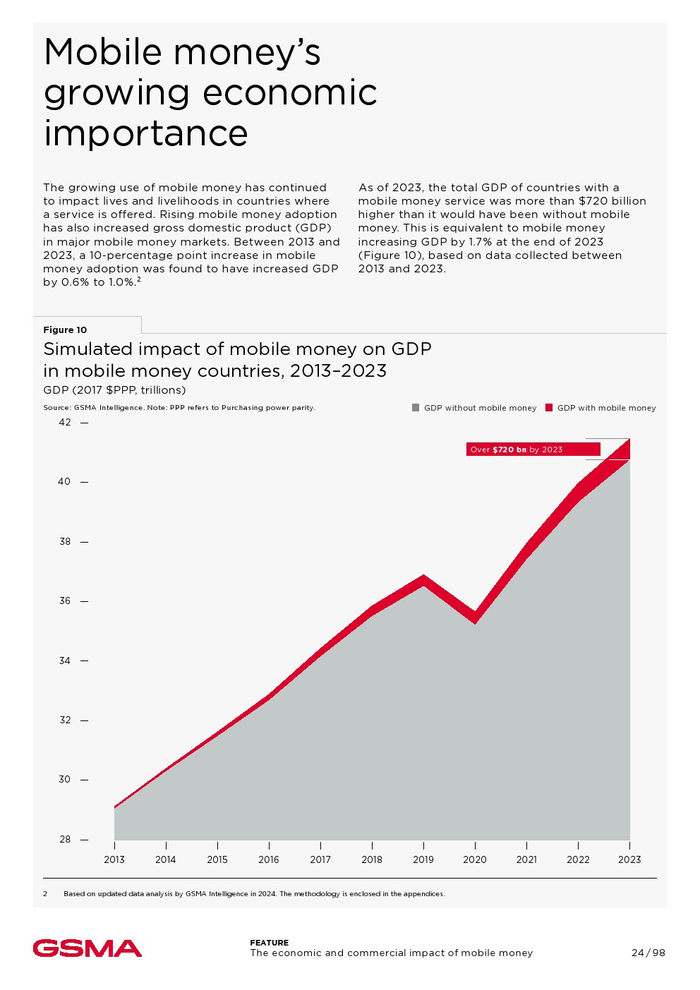 移动支付持续在经济发展中发挥关键作用。截至2023年底,拥有移动支付服务的国家总GDP比没有这些服务的情况下高出7200多亿美元,反映出移动支付推动GDP增长了1.7%。仅在撒哈拉以南非洲地区,2023年移动支付就为GDP增加了约1900亿美元,显示出其持续的经济影响力。