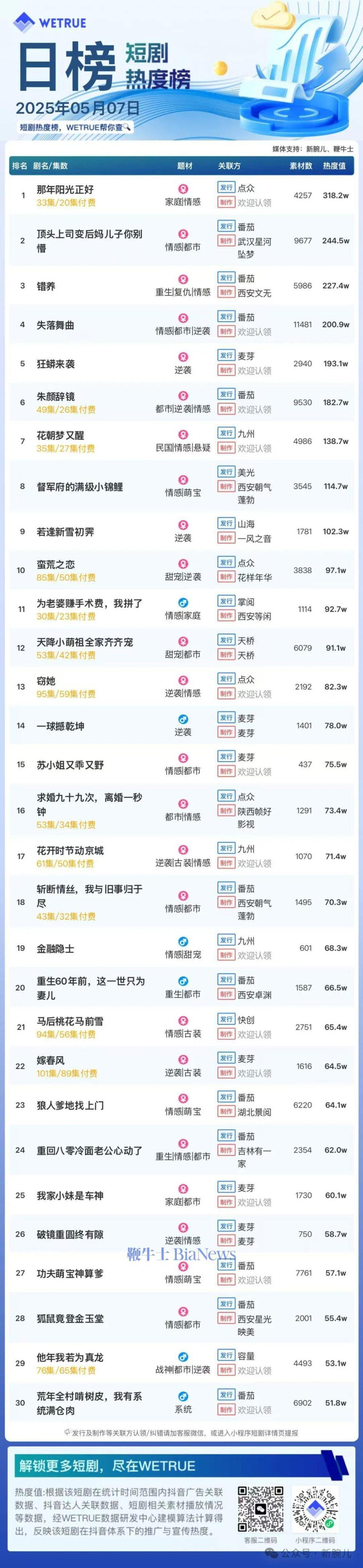 1、本日榜为WETRUE短剧数据公司提供,新腕儿和鞭牛士提供联合支持。