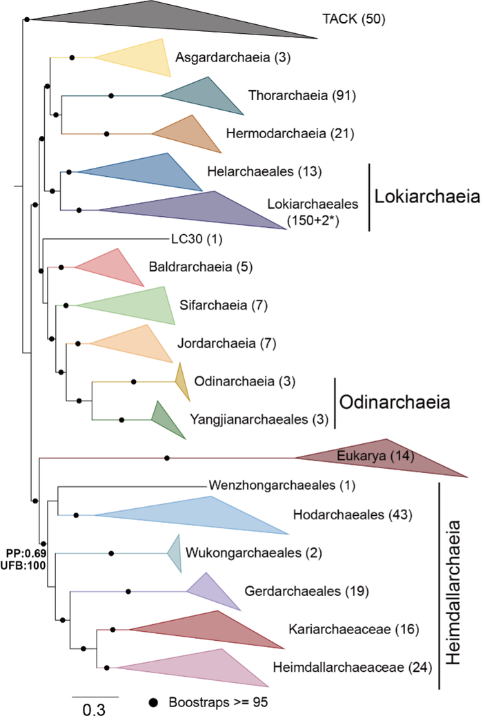 近年来,多项系统发育分析和基因组功能蛋白研究揭示真核生物核基因组可能从阿斯加德古菌进化而来。但随着阿斯加德古菌多样性的增加,定位真核生物祖先在阿斯加德古菌门内部的分化节点显得尤为重要,因为这关乎到真核生物细胞在地球上首次出现的时间,以及彼时古菌祖先的生活方式。