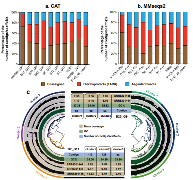 面对这个棘手的问题,研究团队打破常规,采用逆向思维,找到了最关键的解决思路——通过短读长序列回贴、基因组覆盖度分析、序列重叠群聚类和分类谱分析发现涅尔德古菌基因组同时包含阿斯加德古菌及其姐妹超门TACK古菌的序列成分。例如在涅尔德古菌基因组中,大约24-60%的重叠群(Contigs)属于TACK古菌,而仅3-35%的重叠群属于阿斯加德古菌。