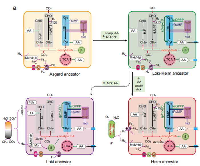 团队在阐明真核生物在阿斯加德古菌中确切位置之后,通过分子定年与祖先代谢重构,推断出阿斯加德古菌与真核生物的最后共同祖先(LAECA)约出现于27.2亿年前(早于大氧化事件),可能是一个使用氢气作为电子供体的厌氧产乙酸古菌。该祖先具有完整的古菌型伍德-隆达尔途径(Wood-Ljungdahl),为其依赖氢气进行化能自养生长提供了可能。