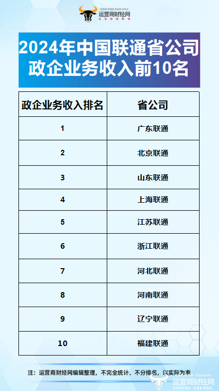 独家:中国联通2024年各省公司政企业务收入排名曝光 这10家最靠前