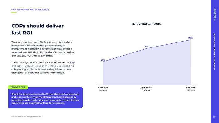 45%的CDP采用率报告在前三到六个月内实现了投资回报率,88%在18个月内实现了投资回报率。