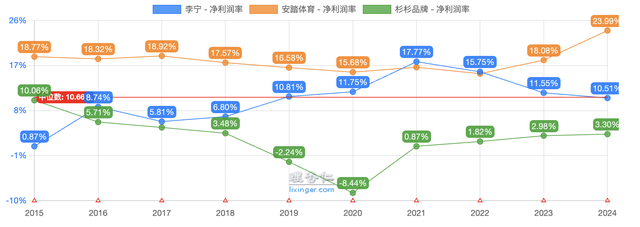 不要小瞧这15%+的净利率,多少品牌爸爸的利润率都达不到这么多,下图分别是李宁、安踏、杉杉的净利润情况,也就安踏能比华利高点(安踏2024的净利率是假的,因为有联营公司╱合营公司损益和由Amer Sports上市事项及Amer Sports配售事项权益摊薄所致的利得,看2023及以前比较正常)。