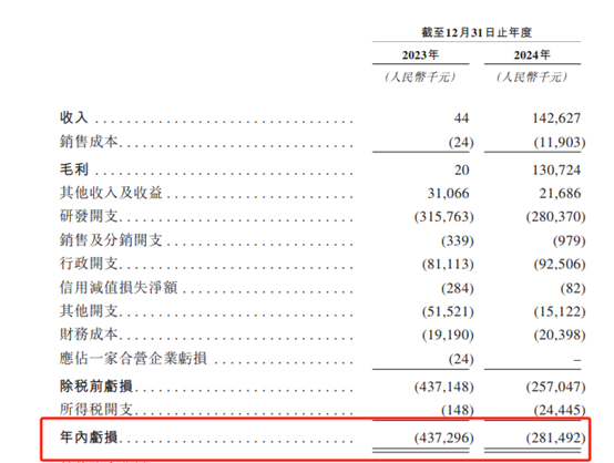 招股书显示,2023年至2024年,公司的营收分别为4.4万元和1.43亿元,对应的净亏损分别为4.37亿元和2.81亿元。