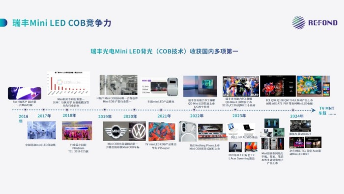 瑞丰光电自2016年研发出国内第一片 Mini LED产品,在2017年搭建起国内第一条Mini LED生产线,并在国内率先实现了 COB 封装形式的 Mini LED 背光产品量产,填补了国内小间距 LED 显示技术和产品的空白,产品先后量产应用于多家知名Mini LED电视终端品牌,获得市场广泛认可。