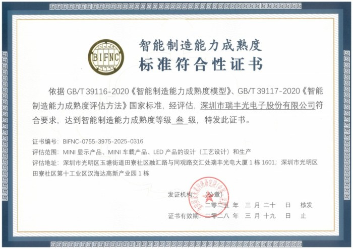 为此,瑞丰光电还获得了“智能制造成熟度三级证书”,在MINI显示产品、MINI车载产品、LED产品的设计(工艺设计)和生产达到三级集成级水平,不仅彰显了瑞丰光电在智能制造领域完善的管理体系和实践经验,更为其提升产品核心竞争力、抢占行业技术制高点奠定坚实基础。