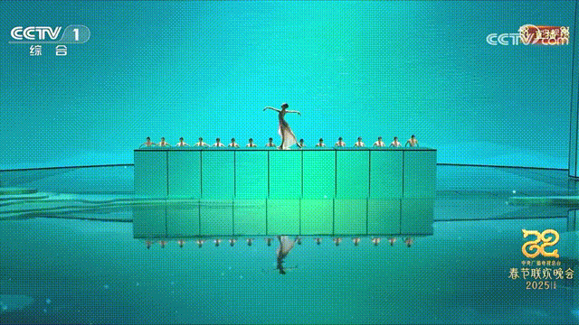 2025央视蛇年春晚 · 现代芭蕾《伊人》-舞者脚尖划出的水纹与舞台特效互动,洲明团队运用UE特效展现“所谓伊人、在水一方”的缱绻诗意。