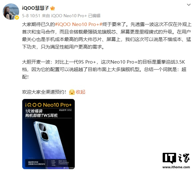 IT之家 5 月 10 日消息,iQOO Neo 系列产品经理罗佳慧 5 月 8 日全网首爆 iQOO Neo10 Pro+ 真机,这是 iQOO Neo 系列首次和宝马 BMW 合作,共同致敬像素游戏文化,大家后续会看到更多合作细节。