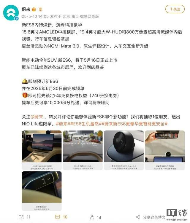 5 月 10 日消息,2025 款蔚来 ES6 车型现已开启预定,该车将于 5 月 16 日正式上市,今天蔚来官方对该车座舱细节进行介绍。