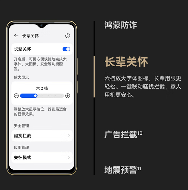 Hi畅享 80系列有着长辈关怀模式,针对长辈的用机特点,提供六档放大字体图标,让屏幕字体清晰放大。并且相关的大字体、大图标、骚扰拦截等功能集成在一个界面,一次设置就全搞定,安心使用,可一键联动进行骚扰拦截,骚扰、诈骗、广告电话一并阻隔。