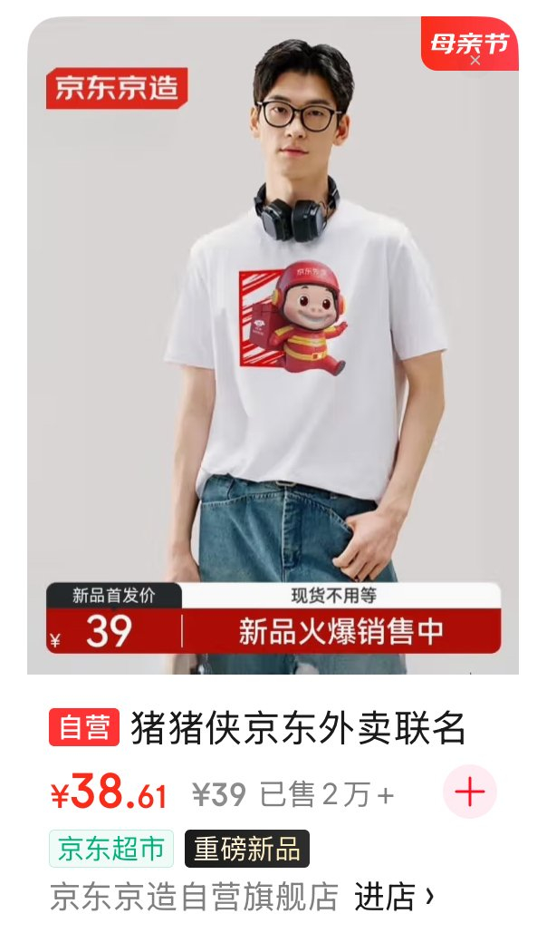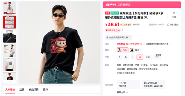 据了解,该T恤是京东外卖与猪猪侠的联名款,售价39元,可选黑、白两款配色,页面显示售出超2万件。