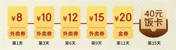 每日打卡奖励为第1/3/6/9/12天解锁满减外卖券,连续15天打卡奖励40元饭卡,每15天为一轮打卡期,结束后可重开新一轮。